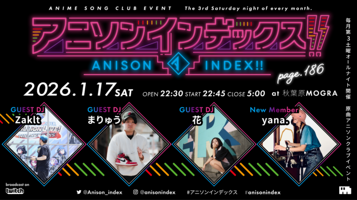 毎月第3土曜日はアニソン原曲クラブイベント『アニソンインデックス!!』