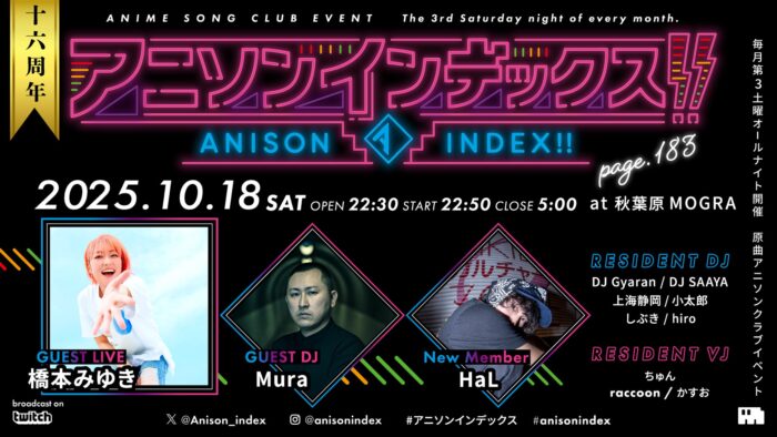 毎月第3土曜日はアニソン原曲クラブイベント『アニソンインデックス!!』