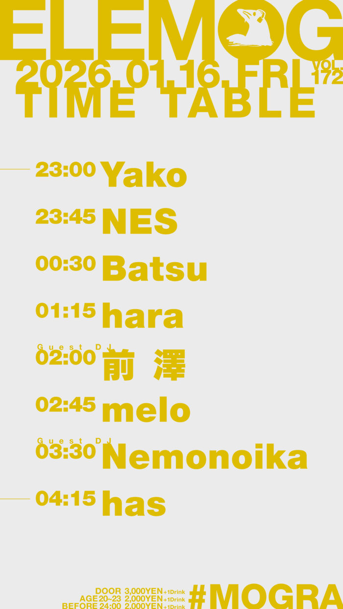 ・BEFORE 24:00 ¥2,000 +1Drink(¥700) / 23時~24時までにご入場の方はこちらの料金でご入場頂けます。