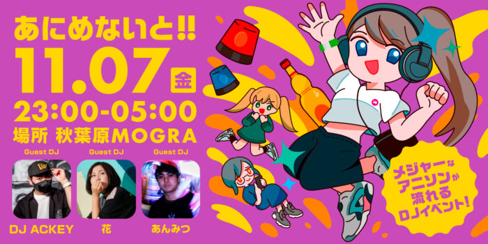 2022年1月からは秋葉原MOGRAにて毎月第1金曜に開催されている『 あにめないと!! 』のレギュラーDJとして加入。