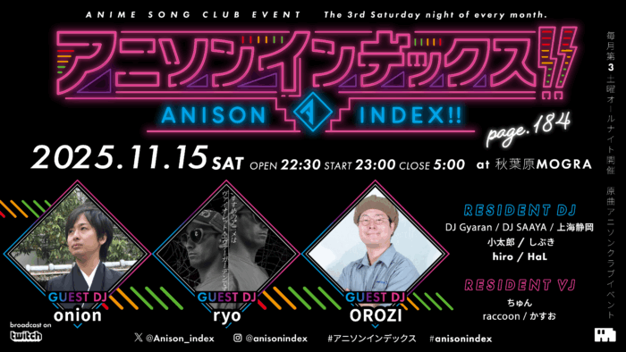 秋葉原MOGRAにて毎月第3土曜に開催されているANISON INDEX!!レギュラーDJ。