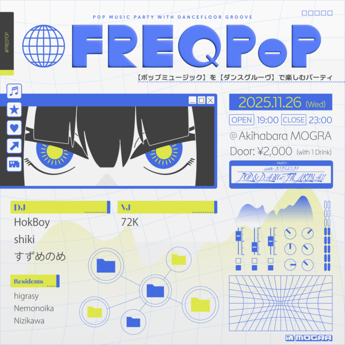 『#FREQPOP』は、その中でもクラブで聞きたいダンサブルなサウンドを共通項に、様々な垣根を越えてフロアを楽しむ平日パーティです!