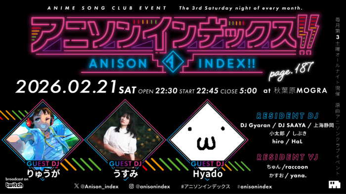 秋葉原MOGRAにて毎月第3土曜に開催されているANISON INDEX!!レギュラーDJ。