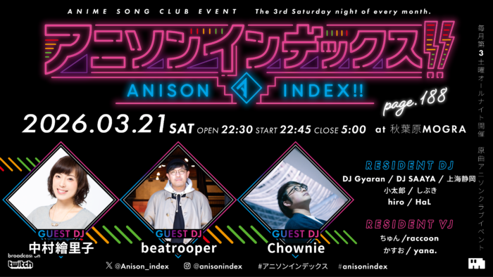 秋葉原MOGRAにて毎月第3土曜に開催されているANISON INDEX!!レギュラーDJ。