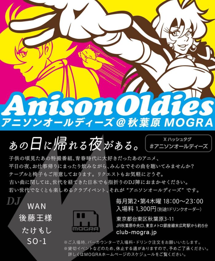 MOGRAを中心に多方面で活躍するDJたちが平日のMOGRAに集合し、幅広い年代のアニメ、声優、同人音楽等を幅広くプレイ!